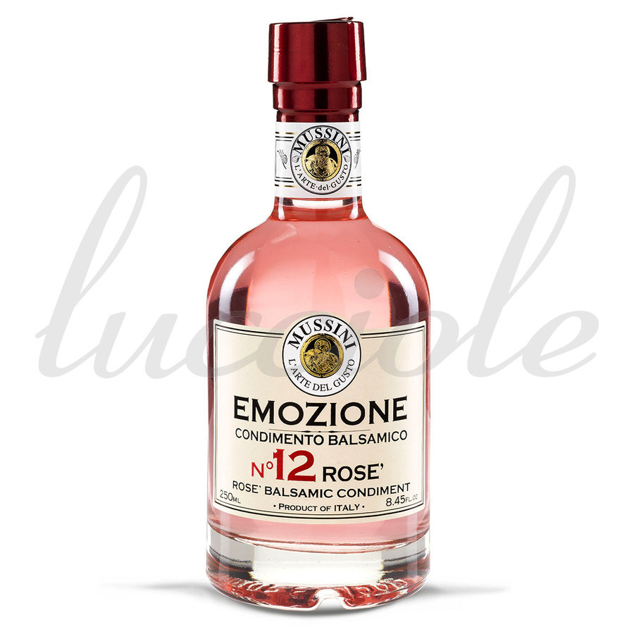Condimento Balsamico Rose Emozione No.12 to majstersztyk octów balsamicznych z Modeny. Dwunastokrotny proces zmiany beczek w procesie powolnego redukowania objętości moszczu winogronowego, doskonałej jakości biały ocet winny i ponad stuletnia tradycja rodziny Mussini. Perfekcja tkwi w prostocie i wiedzy. Balsamico ma przyjemny i pociągający różowy kolor, który jest w 100% naturalny, bez dodatków i barwników. Rose Emozione No.12 jest wspaniałym dodatkiem do sosu, który wykorzystasz do świeżych ostryg, carpaccio z ośmiornicy, czy krewetek. Modny wygląd powoduje, że znajdziesz go również u barmanów jako zaskakujący składnik koktajli i bezalkoholowych drinków. W smaku balansujący przyjemną słodycz z niewygórowaną kwasowością, o aksamitnej strukturze, aromatach czerwonych owoców i róży.