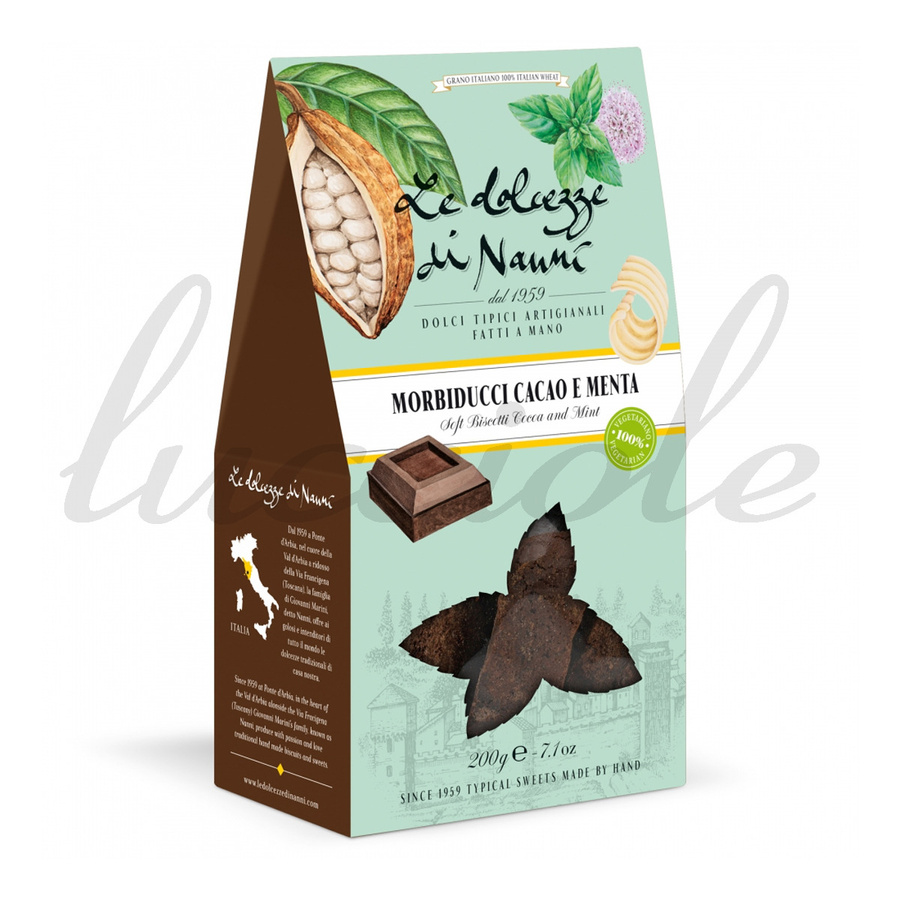 Dolcezze di Nanni to pracownia cukiernicza zlokalizowana nieopodal Sieny wśród malowniczych wzgórz Toskanii. Produkty, które pieką są tworzone według tradycyjnych rodzinnych receptur założyciela piekarni Giovanniego, którego zdrobniale nazywano Nanni. Doskonałe składniki i staranność produkcji są wizytówką rodzinnej firmy. Morbiducci Cacao e Menta to miękkie ciasteczka z pysznym nadzieniem czekoladowym przełamanym odrobiną aromatycznej mięty, bardzo delikatne i rozpływające się w ustach. Włoskie biscotti, które możesz serwować z kawą herbatą lub kieliszkiem deserowego wina. Produkt zapakowany jest w eleganckie pudełko kartonowe wspaniale nadające się na prezent.