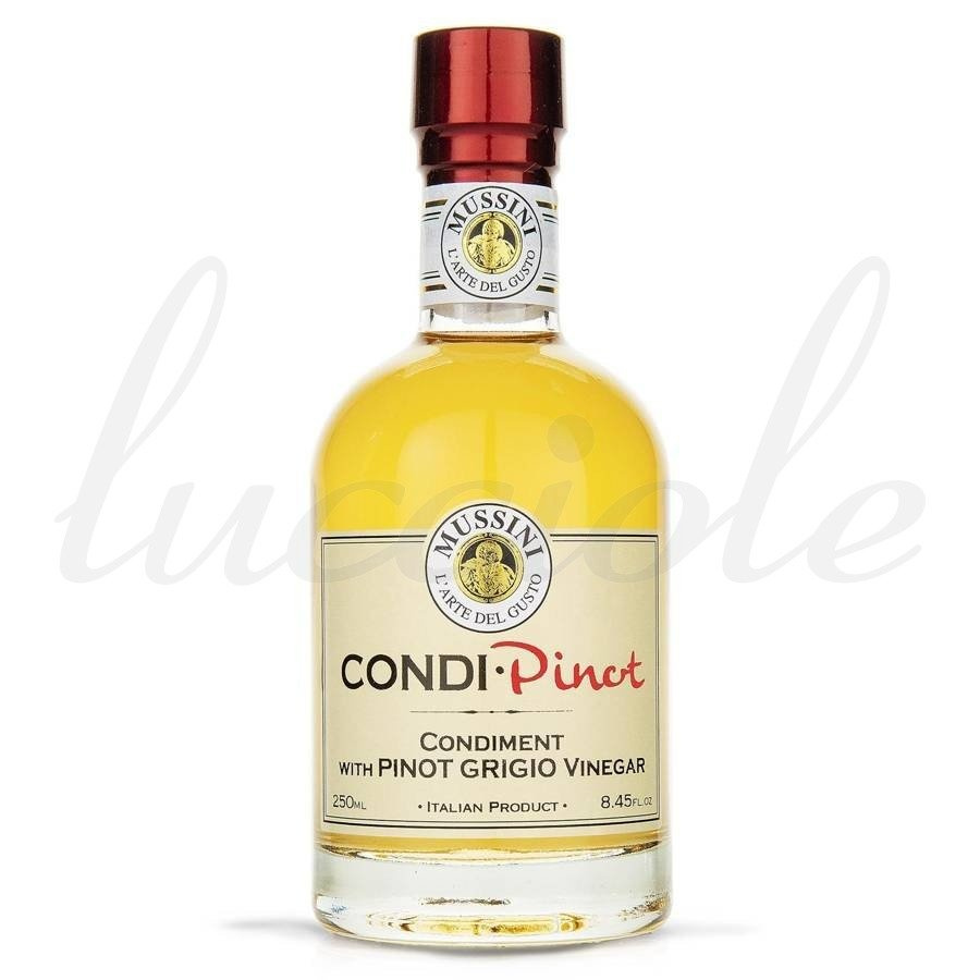 Dressing balsamiczny z Modeny o proporcji zagęszczonego moszczu winogronowego do octu winnego i innych sładników ~70% - 30%, kwasowości 4% oraz gęstości o współczynniku: Premium 1,28. O samym procesie produkcji octów balsamicznych Mussini oraz o systemie klasyfikacji jakości przeczytasz w naszym artykule pod osobnym linkiem. Skład: odparowany moszcz winogronowy. ocet z wina Pinot Grigio IGT 20%, naturalny ocet winny, naturalny aromat, zawiera siarczyny. Pochodzenie: Modena, Włochy.