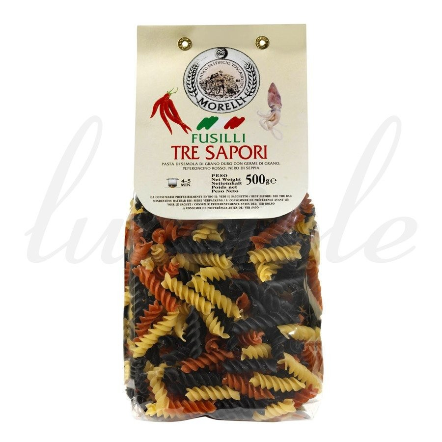 - Makaron Morelli z zarodkiem ziarna pszenicy o kształcie świderków Fusilli w trzech kolorach, wyprodukowany z mąki Semolina Durum bogatej w wartościowe zarodki ziarna pszenicy oraz czerwonego ekstraktu z papryki oraz czarnego atramentu z mątwy.