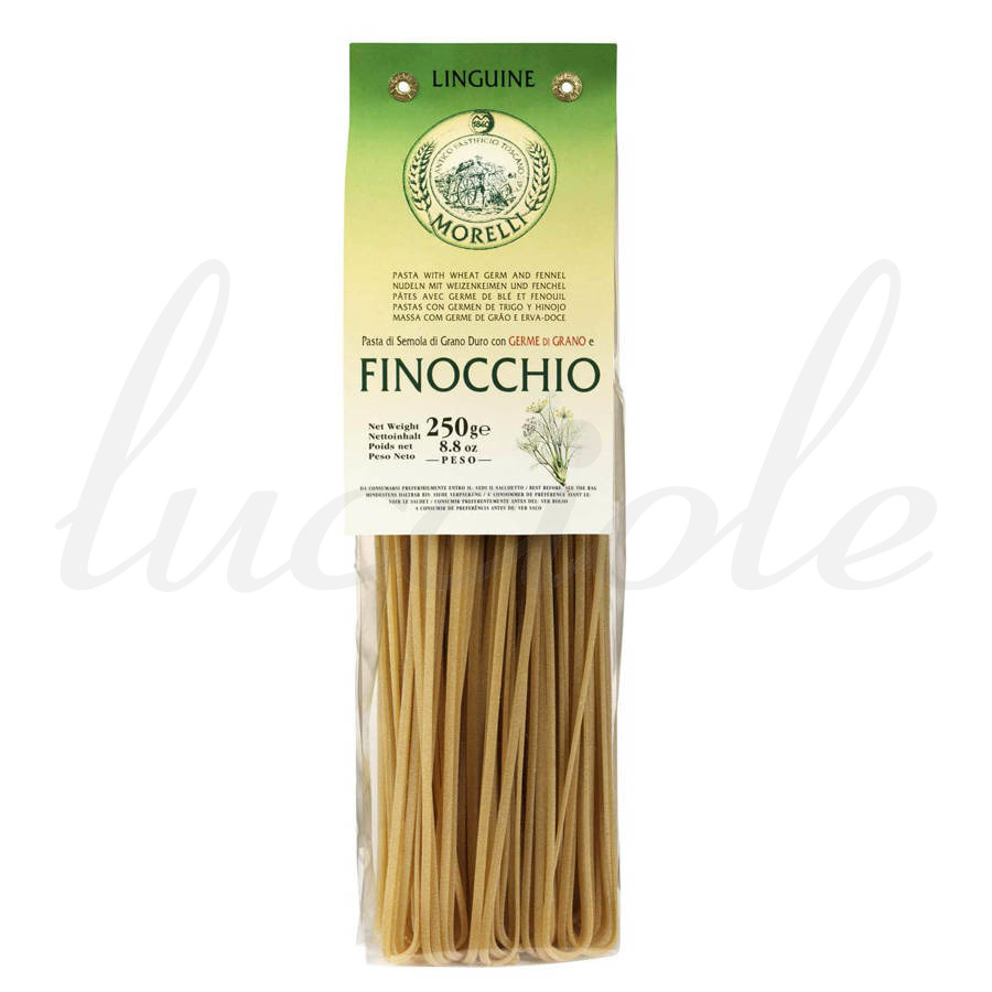 Makaron Morelli z zarodkiem ziarna pszenicy o kształcie nitek Tagliolini, wyprodukowany z mąki Semolina Durum bogatej w wartościowe zarodki ziarna zbóż oraz charakterystycznych dla Toskanii nasion kopru. Makaron ma delikatnie zielonkawy kolor, a nasiona kopru dają orzeźwiającą, ziołową nutę potrawom. Sam koper, jako dodatek do żywności jest niezwykle popularny w miastach na pograniczu Toskanii i Umbrii. Można go często znaleźć w wędlinach, jak na przykład Salame Finocchiona - toskańskie i umbryjskie salami z nasionami kopru oraz typowe dla regionu sery, wypieki i przekąski.