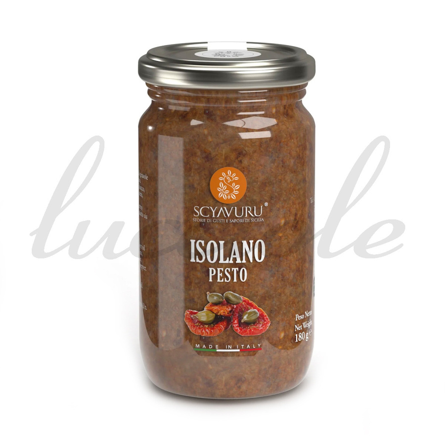 `Pesto Isolano` to domowa pasta wyprodukowana przez renomowanego producenta Scyavuru z Sycylii. Naturalne bogactwo przyrody, klimat, słońce i zamiłowanie do kulinariów lokalnej społeczności są podstawą produkcji najlepszych produktów spożywczych. Pesto Wyspiarskie Isolano pokazuje odmienność smaków i arabskie wpływy na dania Sycylijczyków. Produkt możesz wykorzystać jako gotowy sos do makaronów, dekorację do mięsnych lub warzywnych Ravioli, składnik farszu wielu potraw lub po prostu smarowidło do pieczywa, czy grzanek bruschetti.