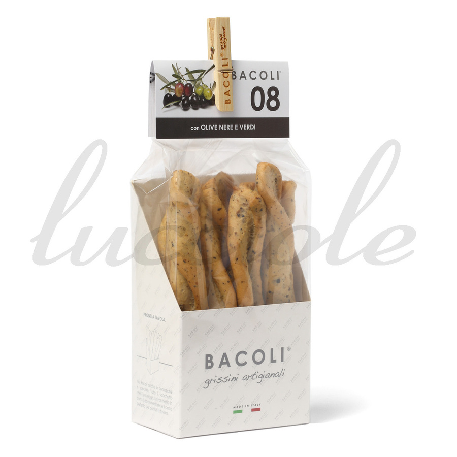 Doskonałej jakości Grissini Artigianali, których delikatna struktura i kruchość dosłownie uzależnia. Włoska klasyka spod ręki mistrzyni cukiernictwa Marty Maristrello, która doprowadziła codzienne przepisy do doskonałości. Oferowane grissini są niebagatelnej grubości, dlatego nazwano je 'Bacoli' od starodawnej nazwy biskupiego kija pasterskiego (baculum - łac.). W tej wersji z dorodnymi szarymi i zielonymi oliwkami, wspaniałe jako dodatek do deski serów lub wędlin, popołudniowego aperitivo owinięte plasterkiem szynki parmeńskiej lub salami z Mediolanu. Opakowanie ma kartonowy ekspozytor oraz wewnętrzny rękaw foliowy, który powoduje, że Bacoli są gotowe do eleganckiego serwowania bez przekładania w inne naczynie. Same naturalne składniki: mąka pszenna typu "0", oliwki 15%, woda, oliwa z oliwek z pierwszego tłoczenia 4%, sól, oregano 1%, cukier, drożdże.