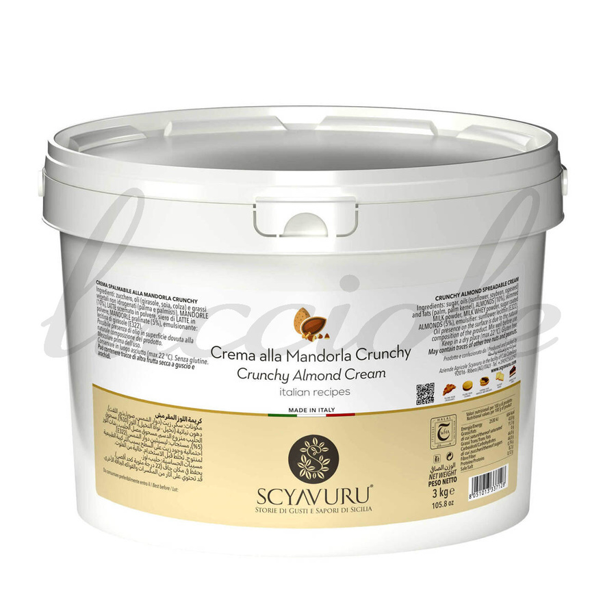 - Sycylijski krem o delikatnej konsystencji, jako masa do smarowania pieczywa lub naleśników, wypełnienie do wypieków, nadzienie do rogalików oraz wielu innych zastosowań. Produkt `Crema alla Mandorla Crunchy` pochodzi od renomowanego producenta `Scyavuru`.