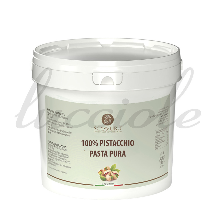 Profesjonalna pasta cukiernicza wyprodukowana wyłącznie z najdoskonalszych sycylijskich pistacji, bez zbędnych dodatków, czy wypełniaczy. Pasta pistacjowa 100% (Pistacchio 100% Pasta Pura) to surowiec dla dla cukierni i gastronomii, będący dodatkiem do mas kremowych wykorzystywanych w tortach, kruchych ciastach, tarteletkach, jako baza do lodów, serników, nadzienie do makaroników z pistacją, pistacjowych rogalików croissante oraz wielu innych kreacjach.