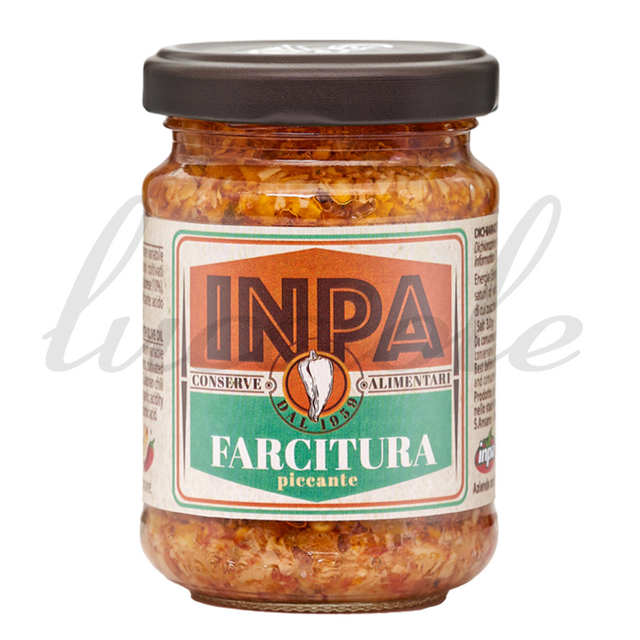 `Pate Farcitura Piccante` to pasta ze świeżych toskańskich warzyw sezonowych z dodatkiem grzybów uprawnych (pieczarka dwuzarodnikowa) oraz ostrej papryczki peperoncino z Kalabrii. Doskonale sprawdzi się z grzankami pieczywa bruschetta, z paluchami grissini, jako tapenada do maczania surowych lub grillowanych warzyw lub jako baza do przeróżnych sosów. Produkt oferowany jest w szklanym opakowaniu 130g, pochodzi od renomowanego dostawcy INPA, znajdującego się w sercu Chianti, w miejscowości Vinci. Nawiązując do perfekcji geniuszu Leonarda da Vinci stworzyli linię idealnych produktów z najlepszych składników, które znajdziesz jedynie w słonecznej Toskanii.