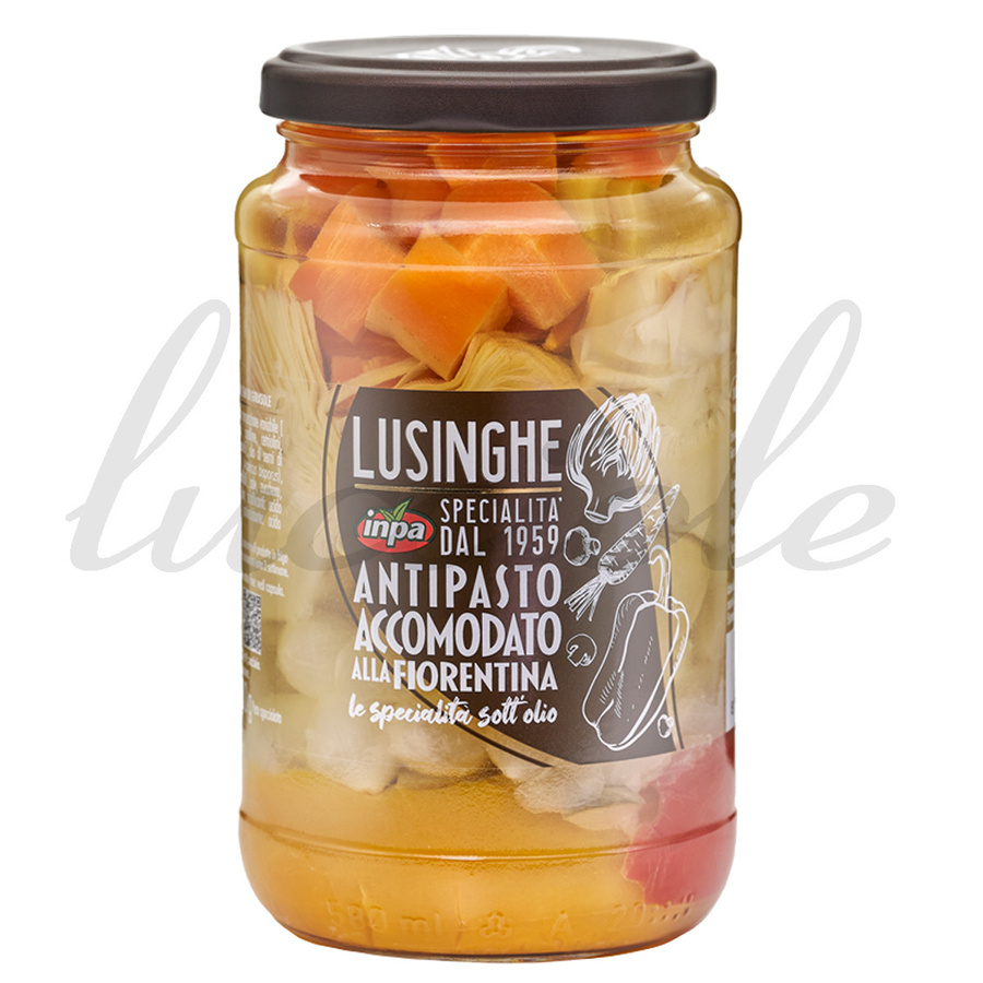 `Antinpasto Fiorentino` to różne sezonowe toskańskie warzywa przygotowane w nieziemsko chrupiący sposób, doskonale komponujące się z innymi przekąskami do wina. Choć produkt wygląda na pozór codziennie, znajomi zazwyczaj są zachwyceni jego smakiem. Niby znane nam w Polsce warzywa, a smak prawdziwie zniewalający. Produkt oferowany jest w szklanym opakowaniu z zalewą 530g w serii Lusinghe, samych suchyh składników jest natomiast 380g. Przetwory pochodzą od renomowanego dostawcy INPA, znajdującego się w sercu Chianti, w miejscowości Vinci. Nawiązując do perfekcji geniuszu Leonarda da Vinci stworzyli linię idealnych produktów z najlepszych składników, które znajdziesz jedynie w słonecznej Toskanii.