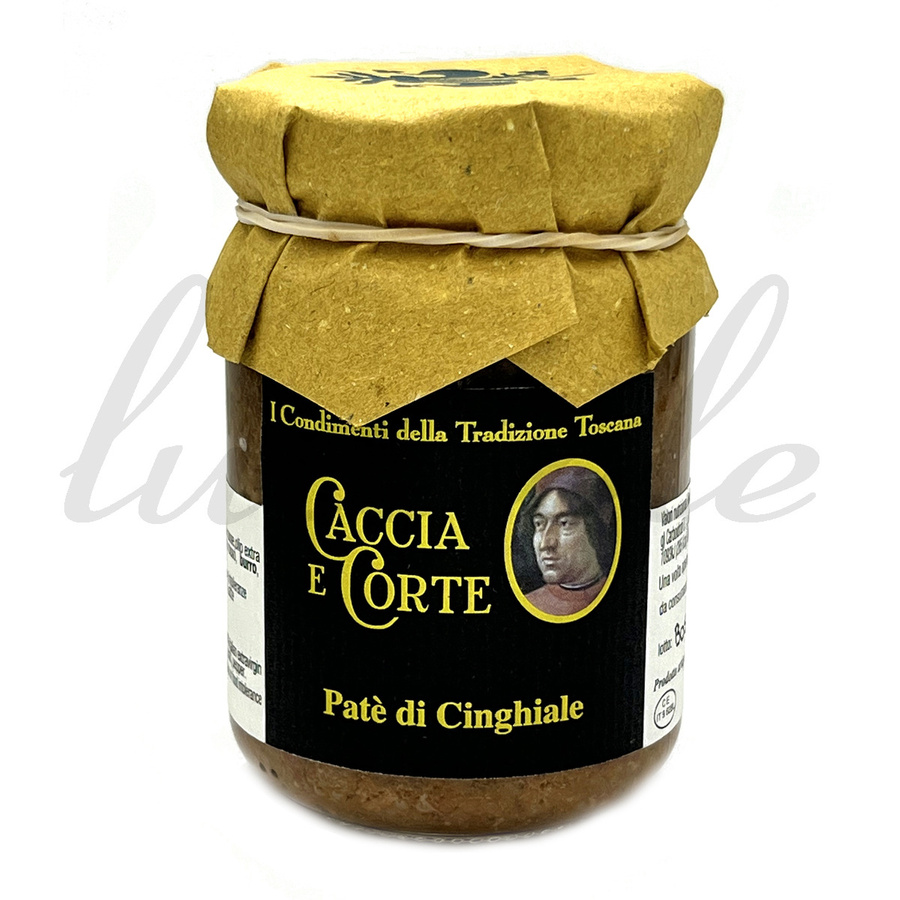 Sosy na bazie mięs hodowlanych, dziczyzny i warzyw to typowa pozycja w menu Florencji, czy Sieny, a prezentowane Pate di Cingiale jest klasycznym dodatkiem do tostowanych grzanek serwowanych jako przystawka lub Aperitivo wraz z kieliszkiem lokalnego wina. Aż 65% mięsa z dzika i kremowa maślana konsystencja to sekret rodzinnej receptury na sukces. Skład: mięso dzika 65%, czerwona cebula, włoska oliwa extra vergine, ziemniaki, czerwone wino, masło, marchewka, seler, sól, czarny pieprz. Produkcja rzemieślnicza bez dodatku konserwantów i barwników.